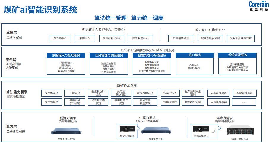 智慧礦山建設是礦山安全管理必經之路,為推進AI智慧礦山建設,鯤云科技推出了包含深入行業場景的AI算法、自主研發的AI算力產品和視頻分析平臺的智慧礦山管理系統。利用充分利舊的原則,將視頻分析設備與礦山井上井下各場景使用的攝像頭相連通過AI智能分析技術對攝像頭采集的視頻數據進行識別,識別分析視頻中的三違作業、主煤流運輸系統、輔助運輸系統中的異常風險,實時對地面和井下關鍵點位進行監測預警,助力礦業企業向智能化礦山轉型升級。
