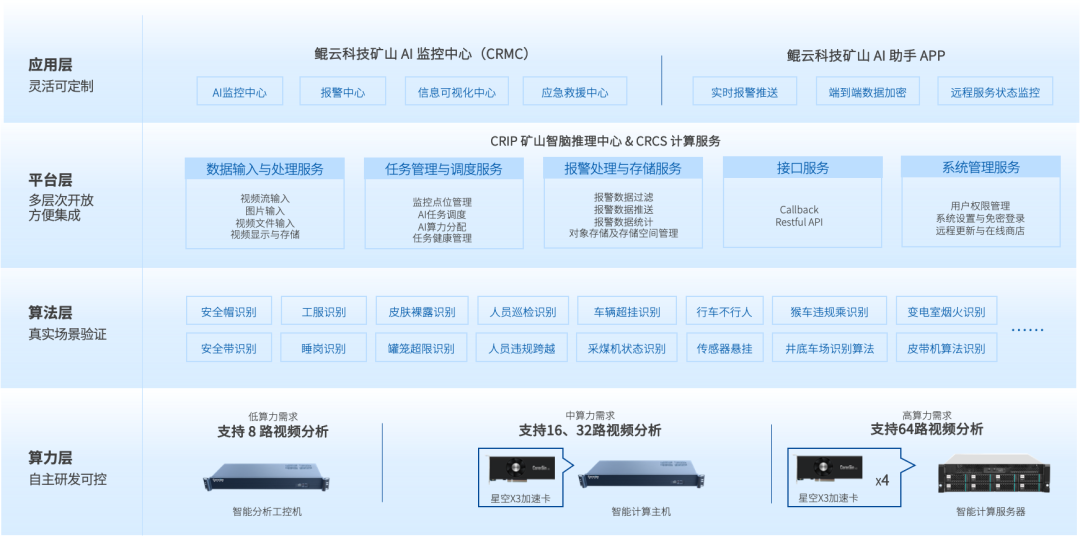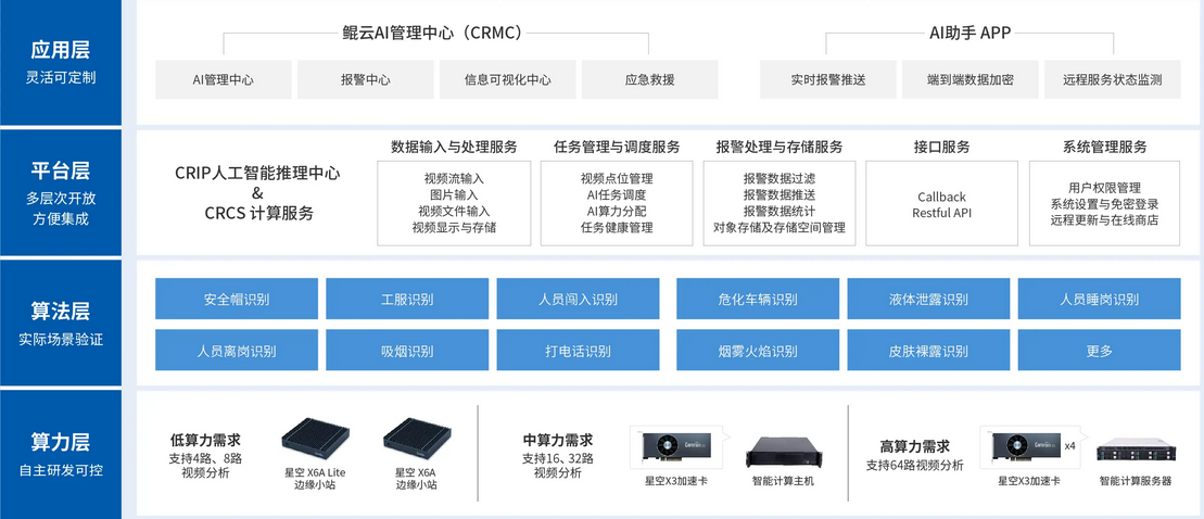 鯤云智能監(jiān)測(cè)系統(tǒng)采用充分利舊原則,利用AI邊緣分析設(shè)備連接前端攝像頭的邊緣部署方式,并連接AI監(jiān)管平臺(tái)和顯示終端形成一套完整的監(jiān)測(cè)系統(tǒng)。通過攝像頭采集實(shí)時(shí)畫面,并對(duì)畫面中的目標(biāo)進(jìn)行檢測(cè)和分析,并將數(shù)據(jù)傳輸?shù)紸I推理中心和管理終端對(duì)預(yù)警結(jié)果進(jìn)行直觀展示,以實(shí)現(xiàn)對(duì)安全隱患的及時(shí)預(yù)警和處理。